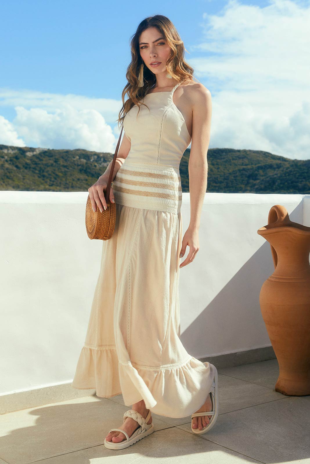 Conjunto Bege Em Voil De Algodão Bordado Com Amarração Nas Costas