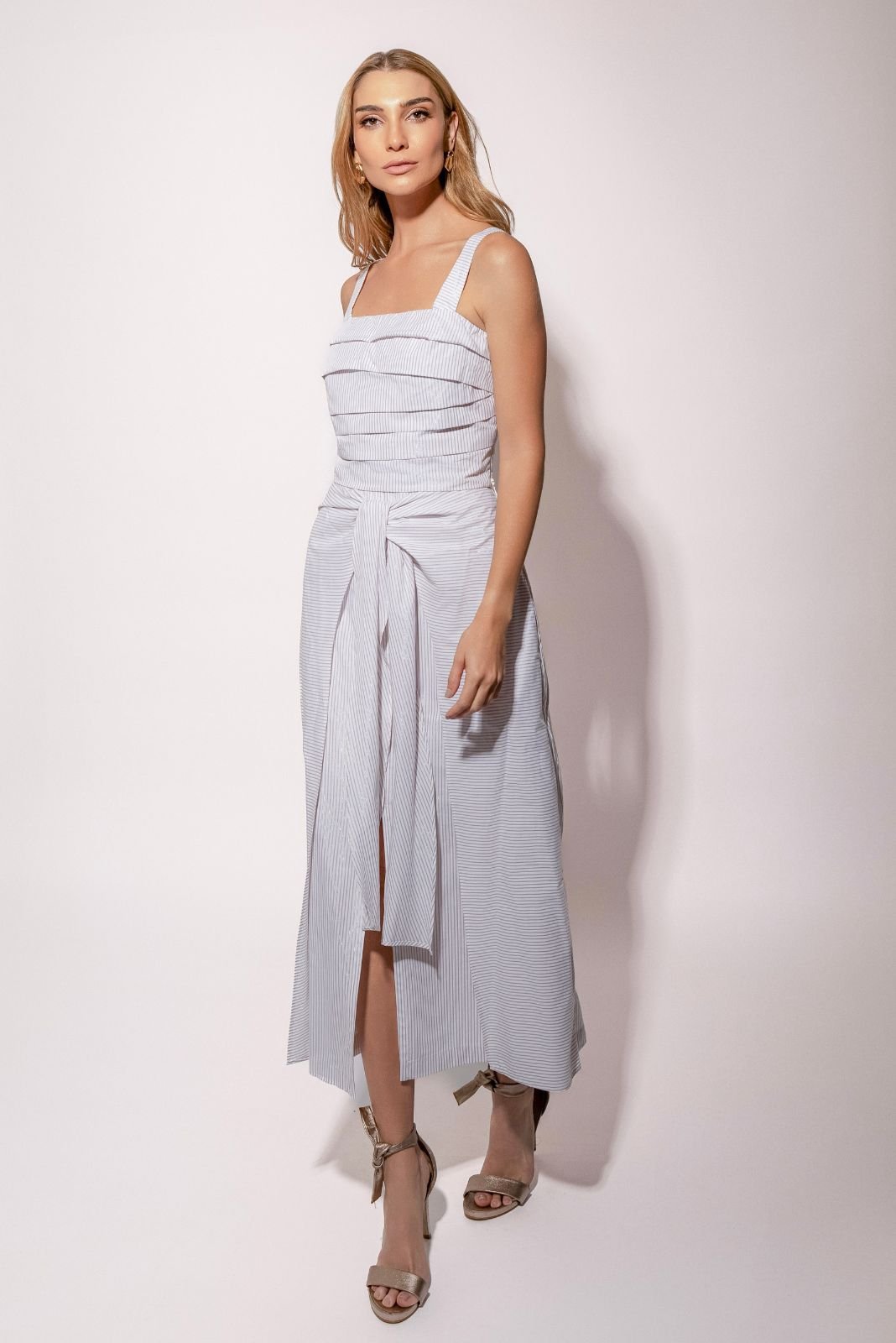 | Produção que equilibra frescor e sofisticação em cada detalhe. O top com alças largas e pregas horizontais valoriza a parte superior do corpo com delicadeza, enquanto a saia de comprimento midi, marcada pela amarração frontal, garante caimento fluido e toque contemporâneo. A fenda frontal acrescenta leveza ao caminhar e transmite modernidade sem perder a elegância. Versátil e atemporal, é a escolha ideal para ocasiões em que estilo, conforto e personalidade precisam caminhar juntos. Composição: 99% Algodão e 1% Poliéster. Modelo está usando tamanho P. Para maior conservação da sua peça: • Leia com atenção a etiqueta de composição localizada no interior da sua peça, nela estará o que é permitido ou proibido para cada tipo de tecido • Lave à mão com sabão neutro e seque à sombra preferencialmente • Evite deixar o produto de molho, principalmente com alvejantes ou produtos usados para tirar manchas • Verifique a etiqueta de composição e certifique -se se a peça pode ser passada com ferro de passar. Ainda que possa, passe a roupa do lavo avesso.  |