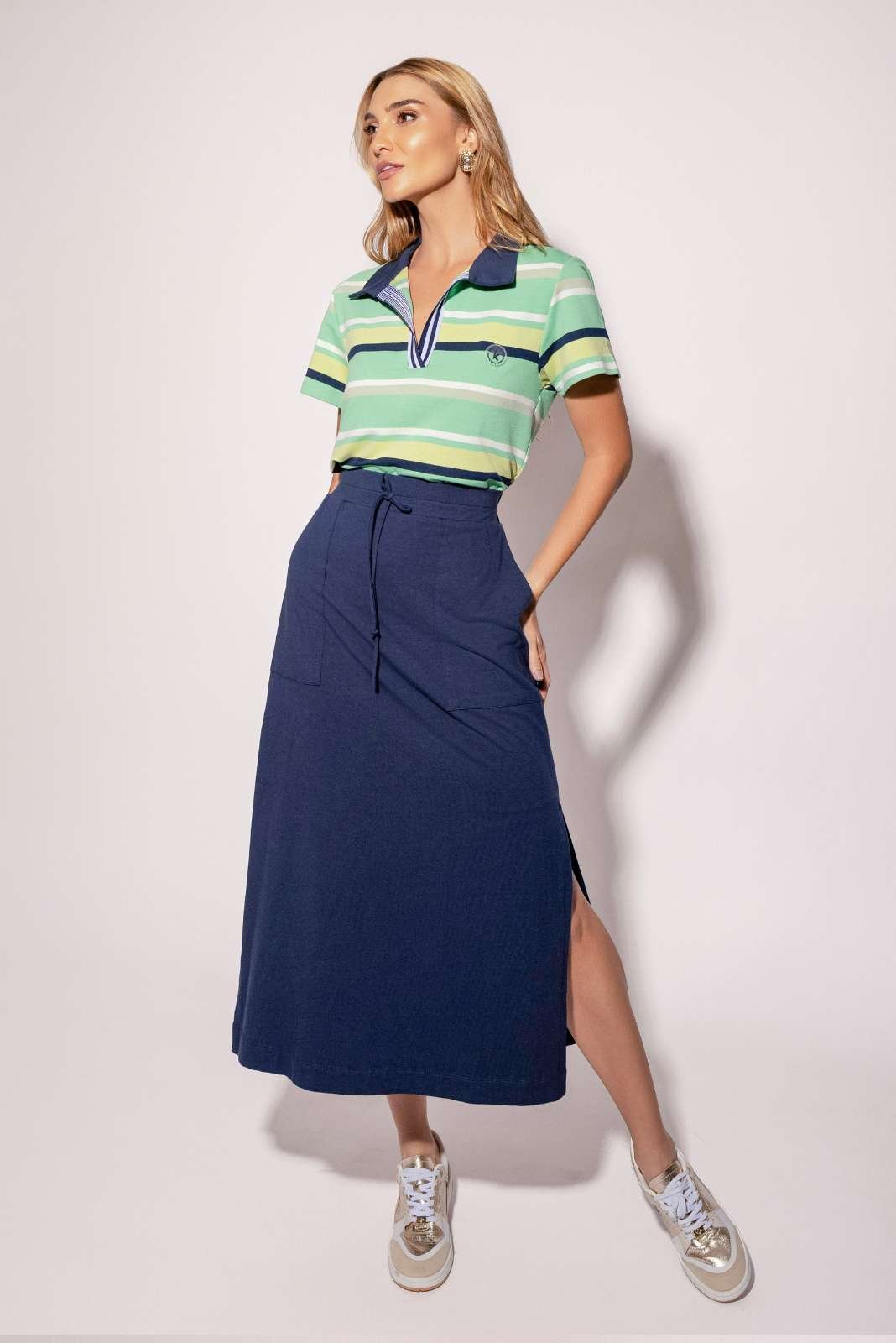 Conjunto de Saia e Blusa Gola Polo Listrada