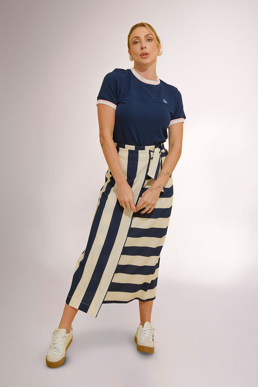 Conjunto de Saia Listrada e Blusa Azul Marinho