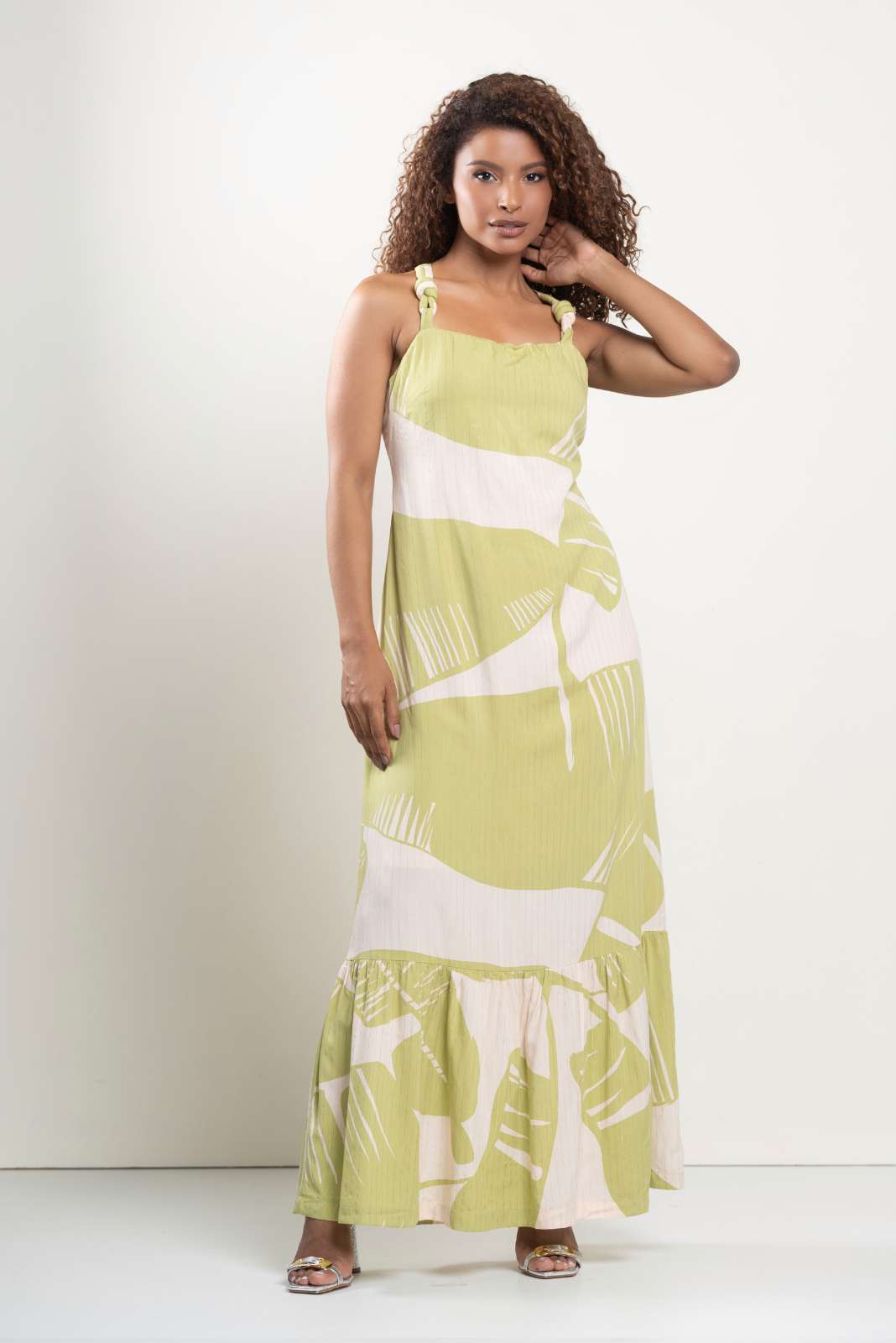 Vestido Longo de Alça de Corda Estampado Verde