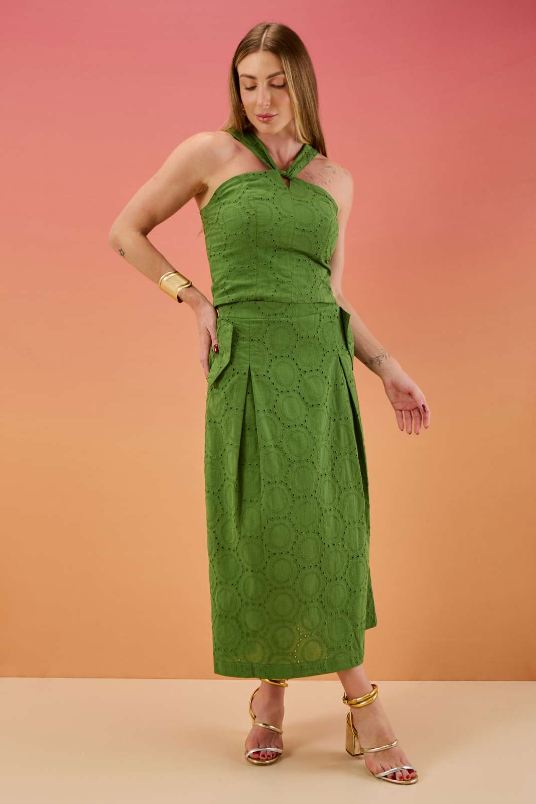 | A elegância do verde traduz o frescor dos dias de sol e a leveza de quem vive o verão em plenitude. Com design elaborado em laise, o conjunto une romantismo e modernidade em uma proposta feminina e cheia de personalidade. O top estruturado valoriza o colo com delicadeza, enquanto a saia midi, com pregas e bolsos aplicados, cria movimento e sofisticação na medida certa. O resultado é uma produção versátil, que vai do almoço ao fim de tarde com charme natural e presença marcante. Uma combinação que celebra o estilo atemporal e a essência vibrante da mulher Kímika. Composição Blusa: 100% Algodão Composição Saia: 100% Algodão Modelo está usando tamanho P. Para maior conservação da sua peça: • Leia com atenção a etiqueta de composição localizada no interior da sua peça, nela estará o que é permitido ou proibido para cada tipo de tecido • Lave à mão com sabão neutro e seque à sombra preferencialmente • Evite deixar o produto de molho, principalmente com alvejantes ou produtos usados para tirar manchas • Verifique a etiqueta de composição e certifique -se se a peça pode ser passada com ferro de passar. Ainda que possa, passe a roupa do lavo avesso. |