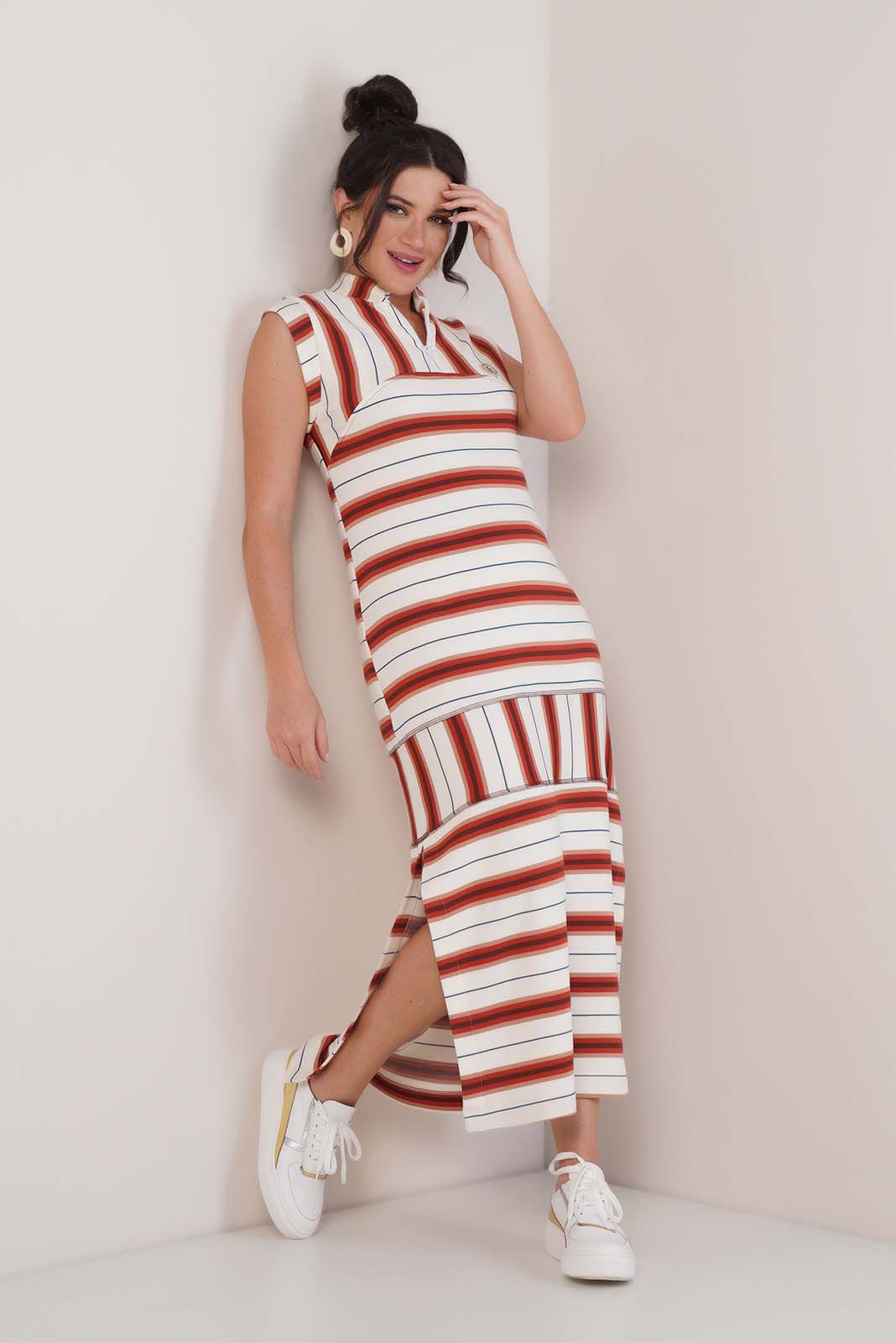 O destaque deste vestido é, sem dúvida, o mix de listras em diferentes direções. Esta escolha ousada e artística cria um efeito visual único, proporcionando uma sensação de movimento e dinamismo ao vestido. As listras são um elemento atemporal, e neste vestido, elas recebem uma interpretação moderna e sofisticada. A gola alta adiciona um toque de sofisticação a este vestido midi. É um detalhe elegante que não só mantém você aquecida em dias mais frescos, mas também confere uma aparência refinada. A gola alta é uma escolha clássica que destaca a atenção aos detalhes. As fendas laterais neste são o elemento de ousadia que equilibra perfeitamente. Elas não apenas adicionam um toque moderno, mas também criam movimento, permitindo que você se mova com graciosidade. As fendas laterais são a escolha ideal para quem busca uma pitada de sensualidade sem comprometer a elegância. |