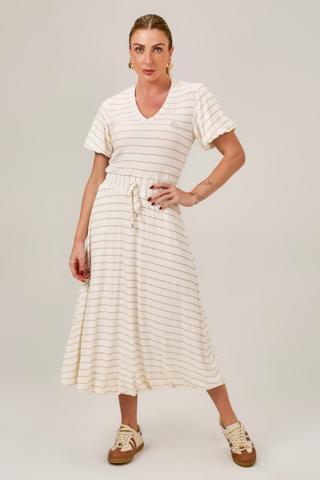| Com aparência delicada e toque extremamente confortável, o vestido traduz um estilo leve e elegante que se adapta a diferentes momentos do dia. A modelagem soltinha, aliada ao caimento fluido, valoriza o corpo de maneira natural, enquanto o decote em “V” alonga a silhueta e adiciona um toque feminino e sofisticado. O ajuste na cintura com cordão permite personalizar o caimento, equilibrando conforto e forma. As listras sutis trazem movimento e charme atemporal à peça, tornando-a uma escolha certeira para quem busca um visual versátil, refinado e com ar despretensioso, ideal para quem quer estar bem vestida com o mínimo de esforço. Composição: 92% Viscose, 4% Elastano, 2% Poliéster e 2% Poliamida. Modelo está usando tamanho P. Para maior conservação da sua peça: • Leia com atenção a etiqueta de composição localizada no interior da sua peça, nela estará o que é permitido ou proibido para cada tipo de tecido • Lave à mão com sabão neutro e seque à sombra preferencialmente • Evite deixar o produto de molho, principalmente com alvejantes ou produtos usados para tirar manchas • Verifique a etiqueta de composição e certifique -se se a peça pode ser passada com ferro de passar. Ainda que possa, passe a roupa do lavo avesso. |